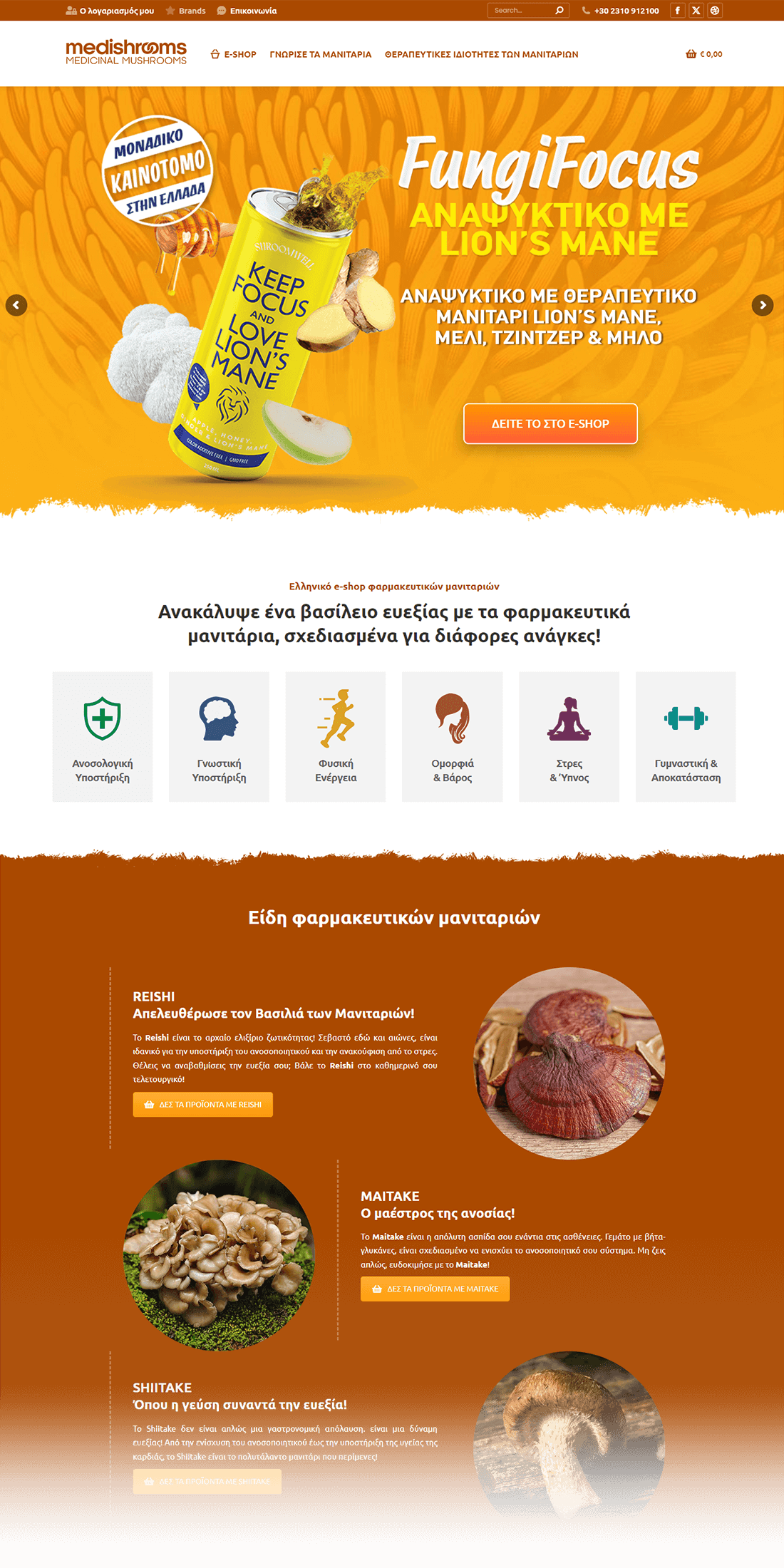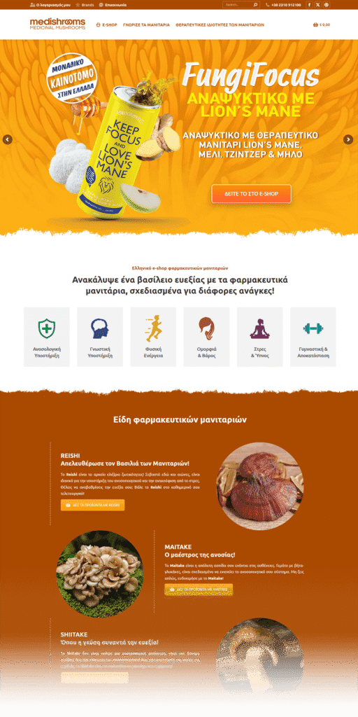medishrooms.gr is an online store specializing in the sale of medicinal mushrooms such as Reishi, Maitake, Shiitake, and Cordyceps, which offer multiple health benefits such as boosting the immune system, improving energy, and relieving stress. The store also offers mushroom-based beverages, such as the popular FungiFocus, a beverage with Lion’s Mane for cognitive enhancement.