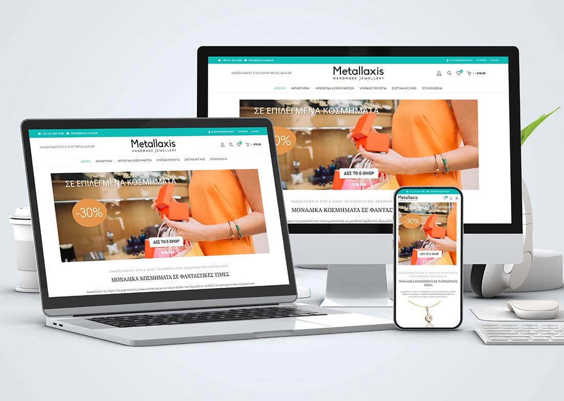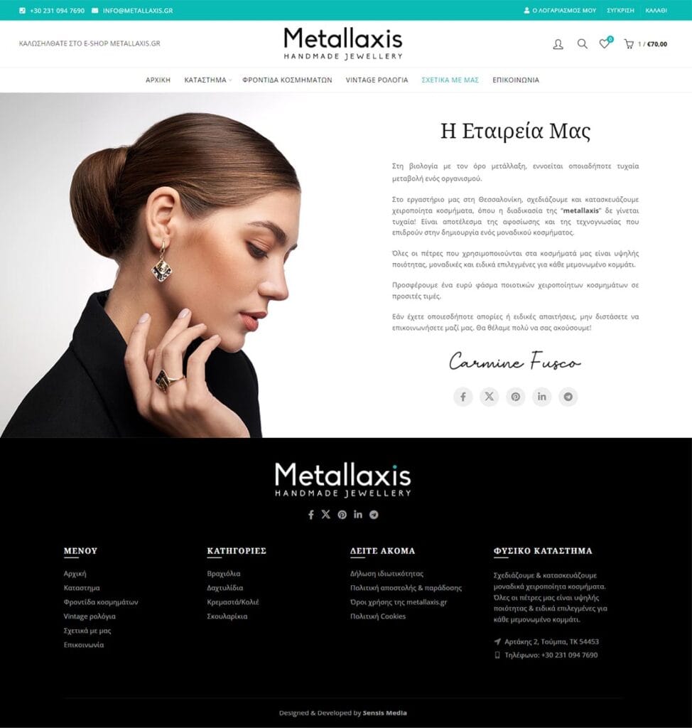 Sensis Media undertook the design and development of the e-shop metallaxis.gr, creating a modern and elegant environment for customers. The e-shop is user-friendly, facilitating navigation and purchases. The product photos present each piece of jewelry with precision, highlighting the details and luxury of the creations.