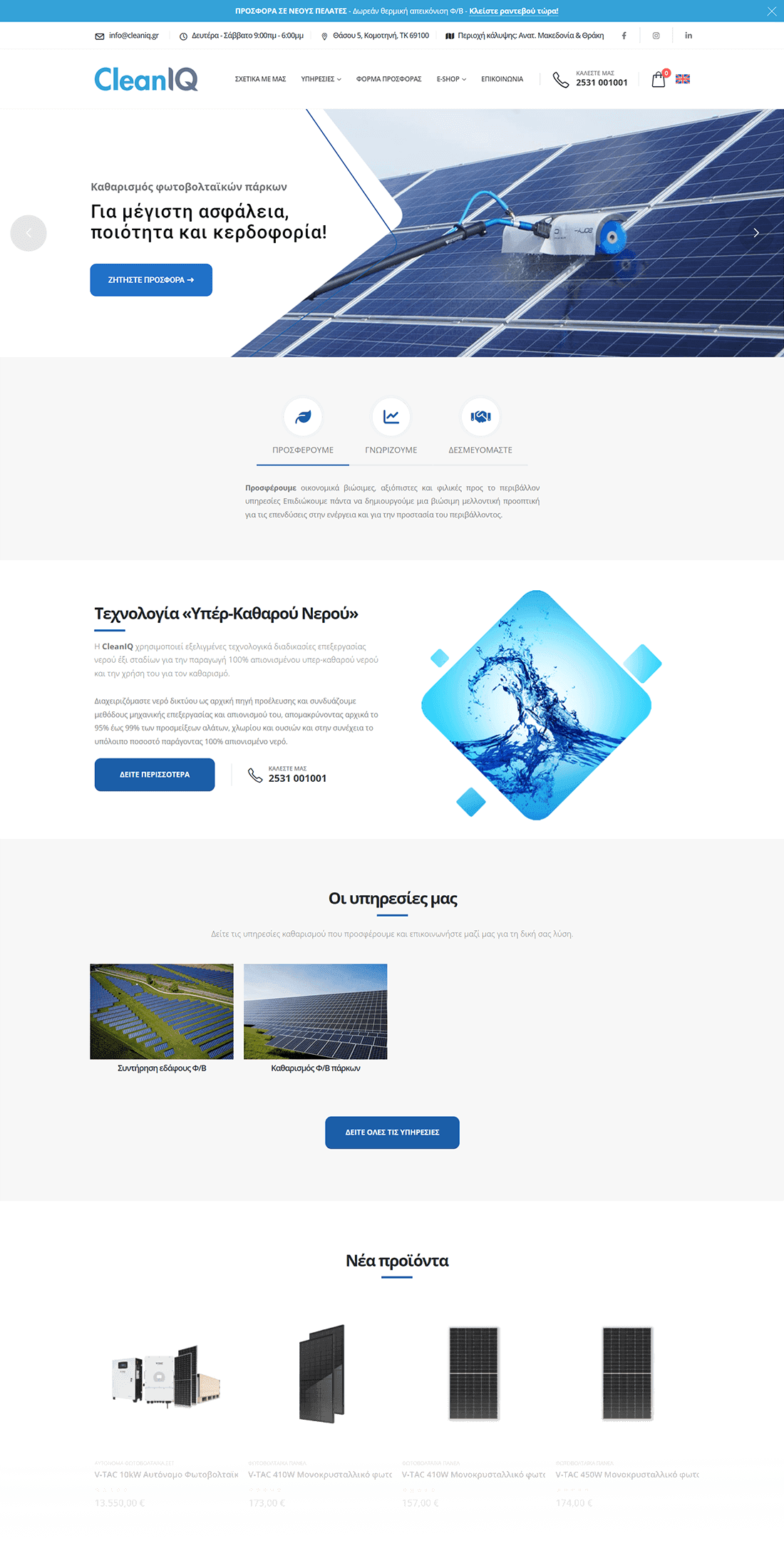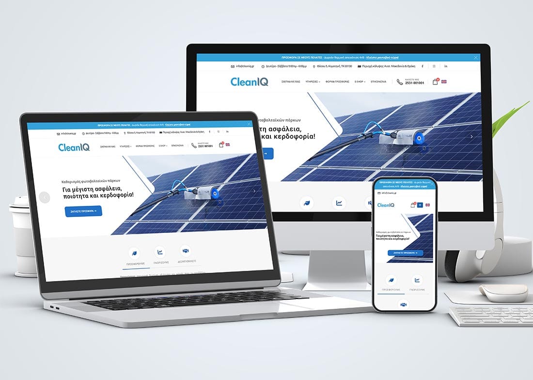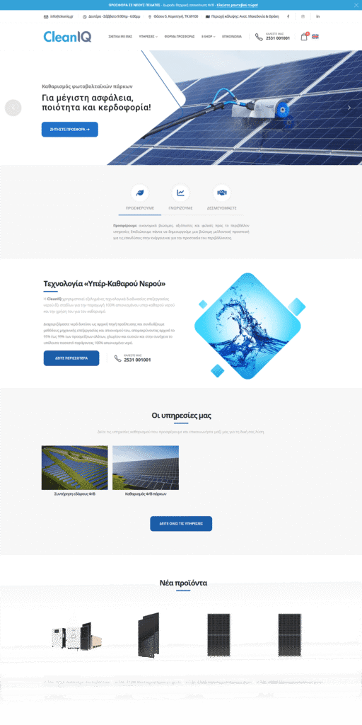 cleaniq.gr is a company specializing in cleaning photovoltaic parks using ultra-pure water technology, improving panel efficiency. Simultaneously, it operates as an e-shop for photovoltaic products, offering a wide range of products such as panels and standalone systems.